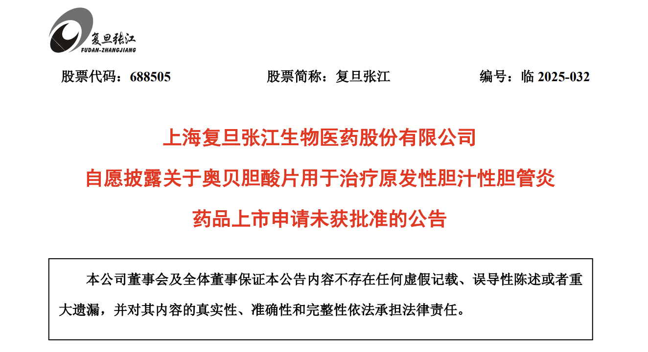 《科创板日报》10月13日讯(记者 史士云)今日,复旦张江(688505.SH)发布公告称,其全资子公司泰州复旦张江药业有限公司(简称“泰州复旦张江”)申报的用于治疗原发性胆汁性胆管炎(PBC)的奥贝胆酸片(规格:5mg、10mg),因不符合药品注册的有关要求,注册申请未获得国家药监局批准。