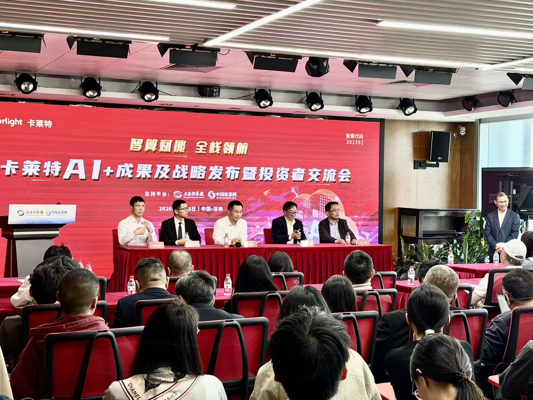 上证报中国证券网讯3月12日,卡莱特AI+成果及战略发布暨投资者交流会在上海证券报深圳路演中心举行。会上,卡莱特董事长周锦志、全球高性能计算(HPC)与人工智能系统交叉领域科学家陈子忠(卡莱特控股子公司络书智算首席科学家)、卡莱特AI应用产品及方案部总经理黄孟怀等公司高管,向投资者详细介绍了公司在AI基础设施、国产算力优化等方面的最新布局进展、产品与解决方案优势以及市场前景。