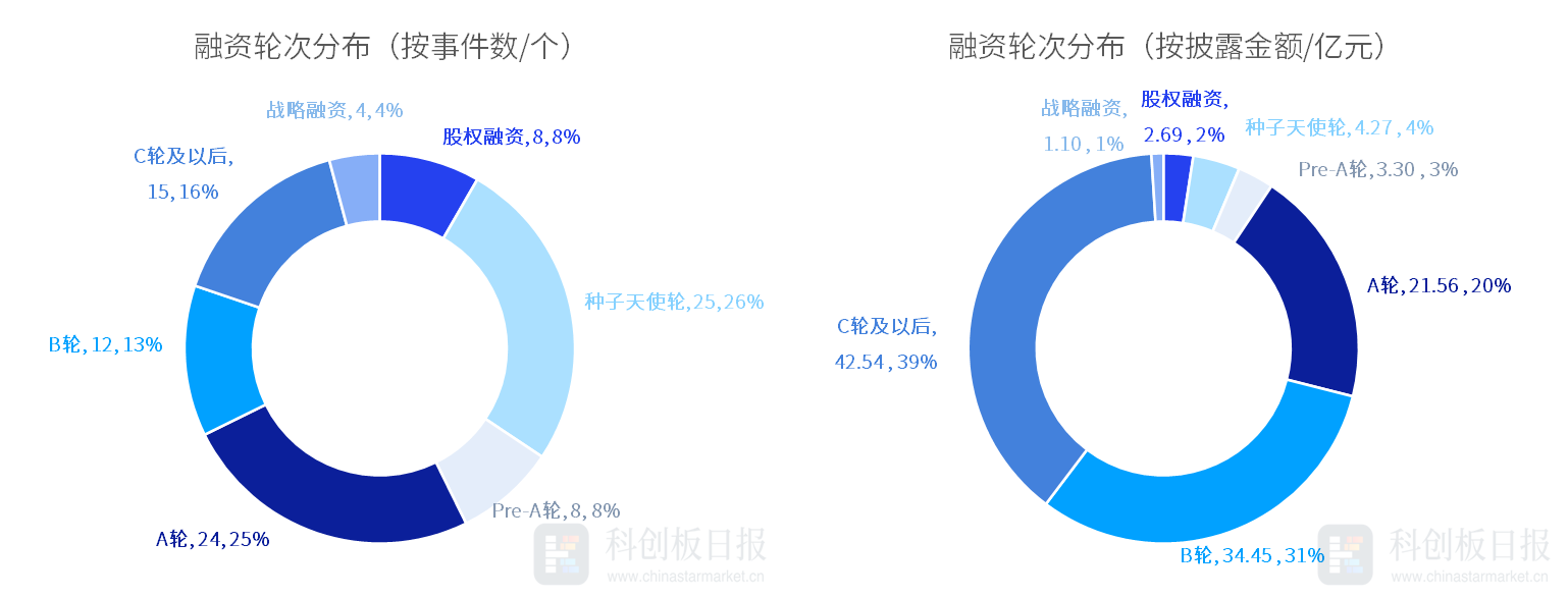 从投资轮次来看,除股权融资外,本周种子天使轮融资事件数最多,发生25起,占比约26%;其次是A轮,发生24起,占比约25%。从各轮次获投金额来看,C轮及以后披露的融资总额最高,约42.54亿元;其次是B轮,约34.45亿元。
