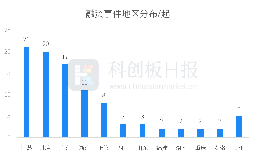 从地区来看,本周江苏、北京、广东、浙江等地公司较受青睐,融资事件数均在10起以上;江苏以21起融资活跃度保持首位。从单个城市看,北京有20家公司获投,位列第一;深圳紧随其后,有12家公司获投。
