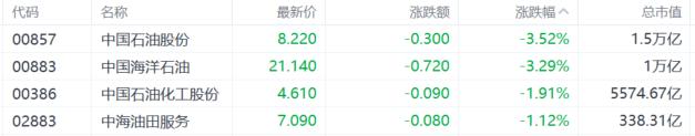 “三桶油”大跌,中国石油股份、中国海洋石油跌超3%,中国石油化工股份跌近2%。消息面上,美国周末对委内瑞拉发起“斩首式”军事行动、强行抓捕委内瑞拉总统马杜罗;另外,OPEC+周日宣布将坚持第一季度暂停增产的计划,因全球市场面临供应过剩,该组织也正等待美国逮捕委内瑞拉领导人马杜罗是否会影响供应的明确性。