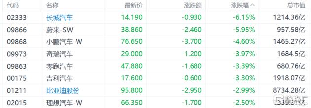 汽车股跌幅居前,长城汽车大跌超6%,蔚来跌近6%,小鹏汽车跌超4%,比亚迪股份、理想汽车跌超2%。各大新能源车企相继交出了2025全年销量的成绩单。从销量达成率来看,虽然多数品牌在2025年销量均创新高,但仅有比亚迪、零跑、小鹏、小米4个品牌完成年度销量目标。
