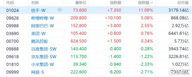 盘面上,大型科技股走势分化,快手大涨11%表现尤其抢眼;生物医药股集体活跃,平安好医生领衔互联网医疗股上涨;内房股拉升,脑机接口概念大爆发。汽车股全天低迷,三桶油集体下跌,内银股走低。