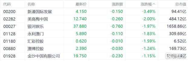 濠赌股低迷,新濠国际发展跌超3%、美高梅中国跌2%,银河娱乐、金沙中国、永利澳门等跟跌。消息上,摩根士丹利最新报告指,澳门去年12月博彩收入为209亿澳门元,按年增长14.8%,按季下降1%,低于市场预期。该行较偏好银河娱乐及金沙中国;美高梅中国在12月表现大幅落后,或有短期反弹机会,评级降至“与大市同步”,对澳博控股维持“减持”评级。