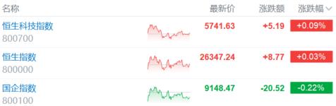 截至收盘,恒生指数微幅上涨0.03%,国企指数跌0.22%,恒生科技指数微涨0.09%。