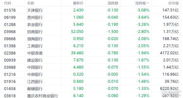 内银股下挫,天津银行跌超5%,贵州银行、农业银行跌超3%,招商银行、工商银行跌超2%。