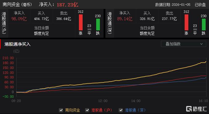 今日,南向资金净买入187.23亿港元,其中港股通(沪)净买入98.09亿港元,港股通(深)净买入89.14亿港元。