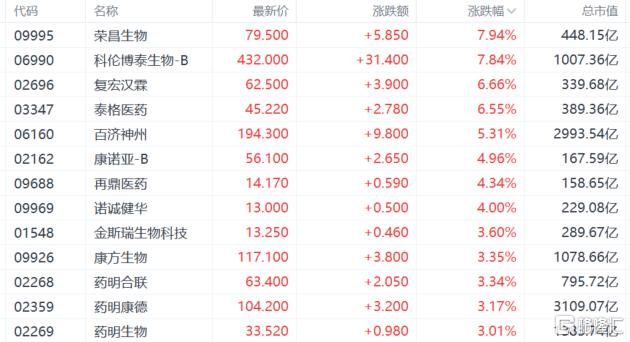 医药股涨幅居前,荣昌生物、科伦博泰生物-B涨超7%,复宏汉霖、泰格医药涨超6%,百济神州涨超5%。