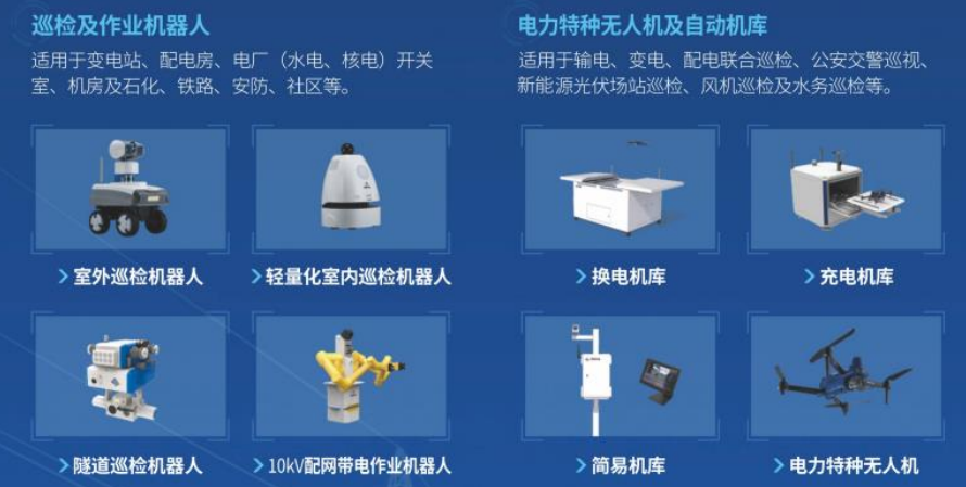 公司首创“慧眼”无人巡检网,网格化集群式巡检作业,全面提升新型电力系统边缘感知和作业能力,提供室外巡检机器人、轻量化室内巡检机器人、隧道巡检机器人、10kV配网带电作业机器人等巡检及作业机器人,慧眼无人机、换电机库、充电机库、简易机库等电力特种无人机及自动机库,红外热像仪等智能红外终端,以及行业级网格化无人巡检及智能作业解决方案,已应用于电力、新能源、交通等行业,实现面向设备、环境及人员的“无人化”智慧运维。