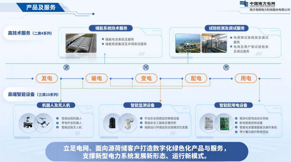 公司以电源清洁化和电网智能化为主线发展主营产品,发展出技术服务和智能设备的两大业务体系,“2服务+3设备”聚焦电力系统智能化。公司的技术服务包括储能系统技术服务和试验检测及调试服务2个类别,智能设备包括智能监测设备、智能配用电设备和机器人及无人机3个类别,产品品类56种。公司的技术产品应用于电力能源系统的电源侧(发电环节)、电网侧(输电环节、变电环节、配电环节)和用户侧(用户环节)相关环节。