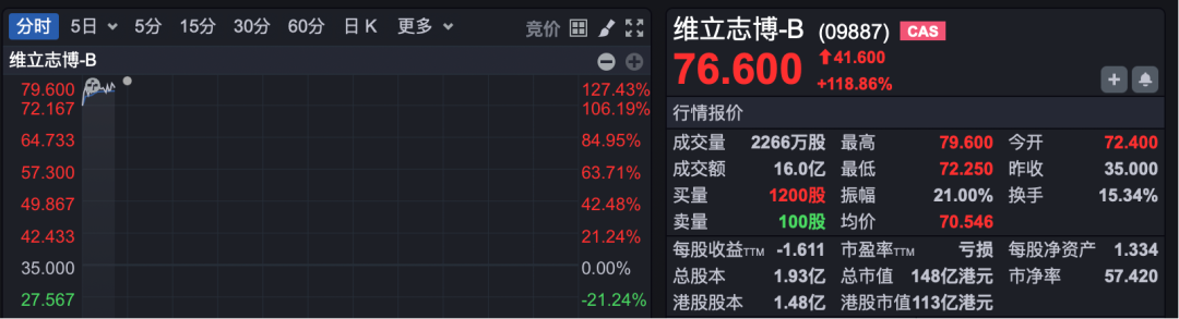 港股创新药维立志博-B上市首日开盘一度涨超120%,现报76.6港元/股。