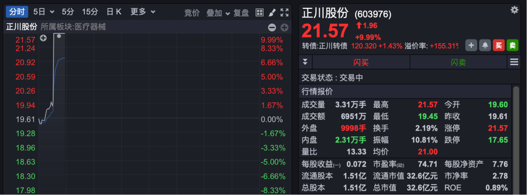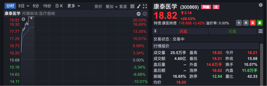 另外,医疗器械板块也持续走高。A股正川股份、康泰医学双双涨停,南微医学涨超10%,鹿得医疗、山东药玻、安杰思、锦好医疗、迈普医学等跟涨。