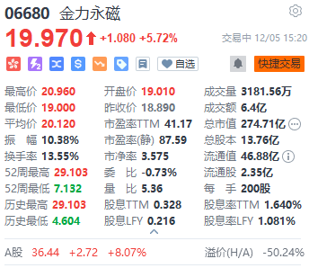 上证报中国证券网讯12月5日,金力永磁午后拉升,一度涨超10%,截至15时20分,金力永磁H股股价回落至19.97港元/股,涨5.72%;A股涨8.07%,报36.44元/股。
