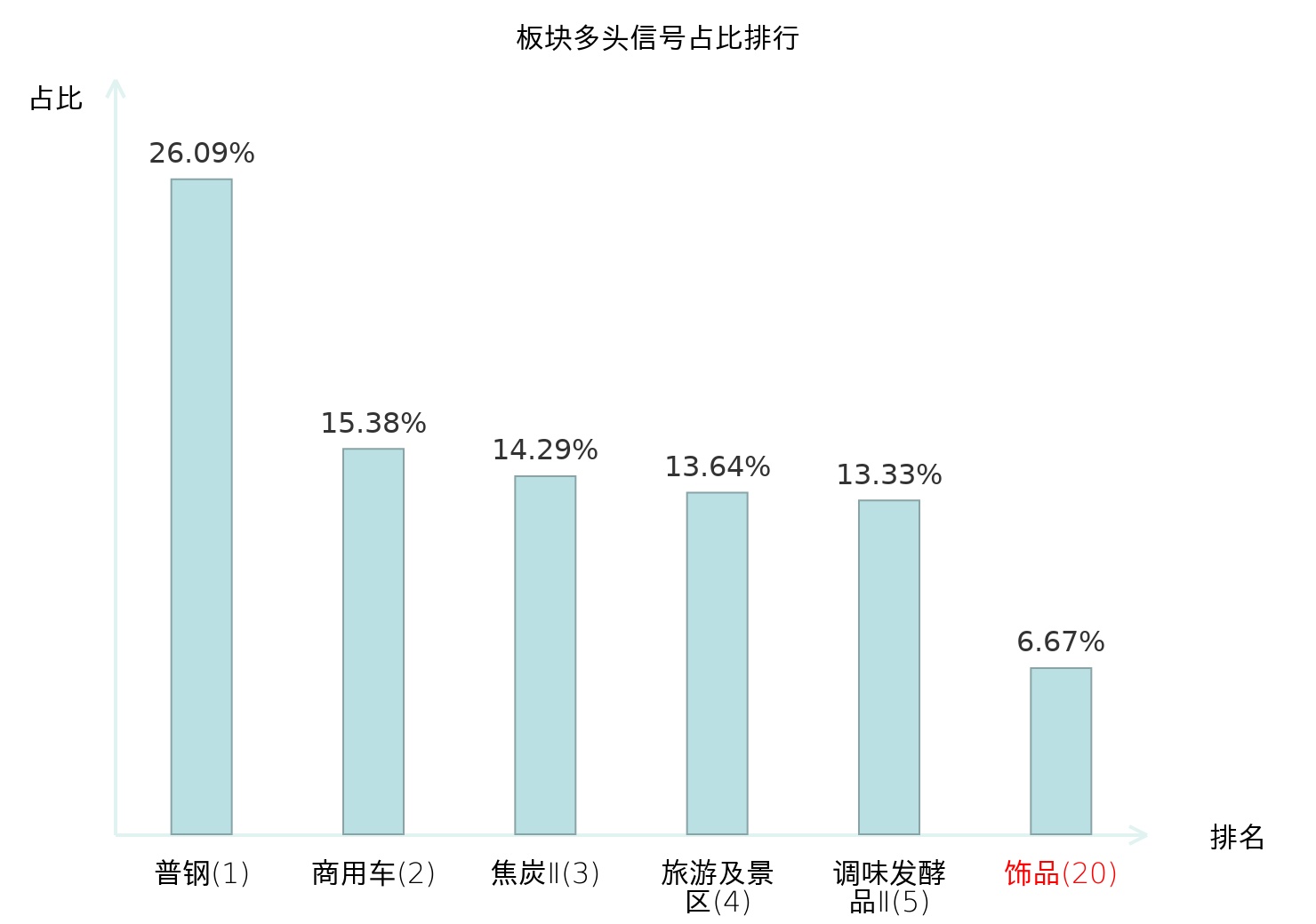 全市场所有行业板块中主力多头信号占比排名中,普钢板块位居第一。焦炭Ⅱ板块名次提升最快,较昨日上升119位。