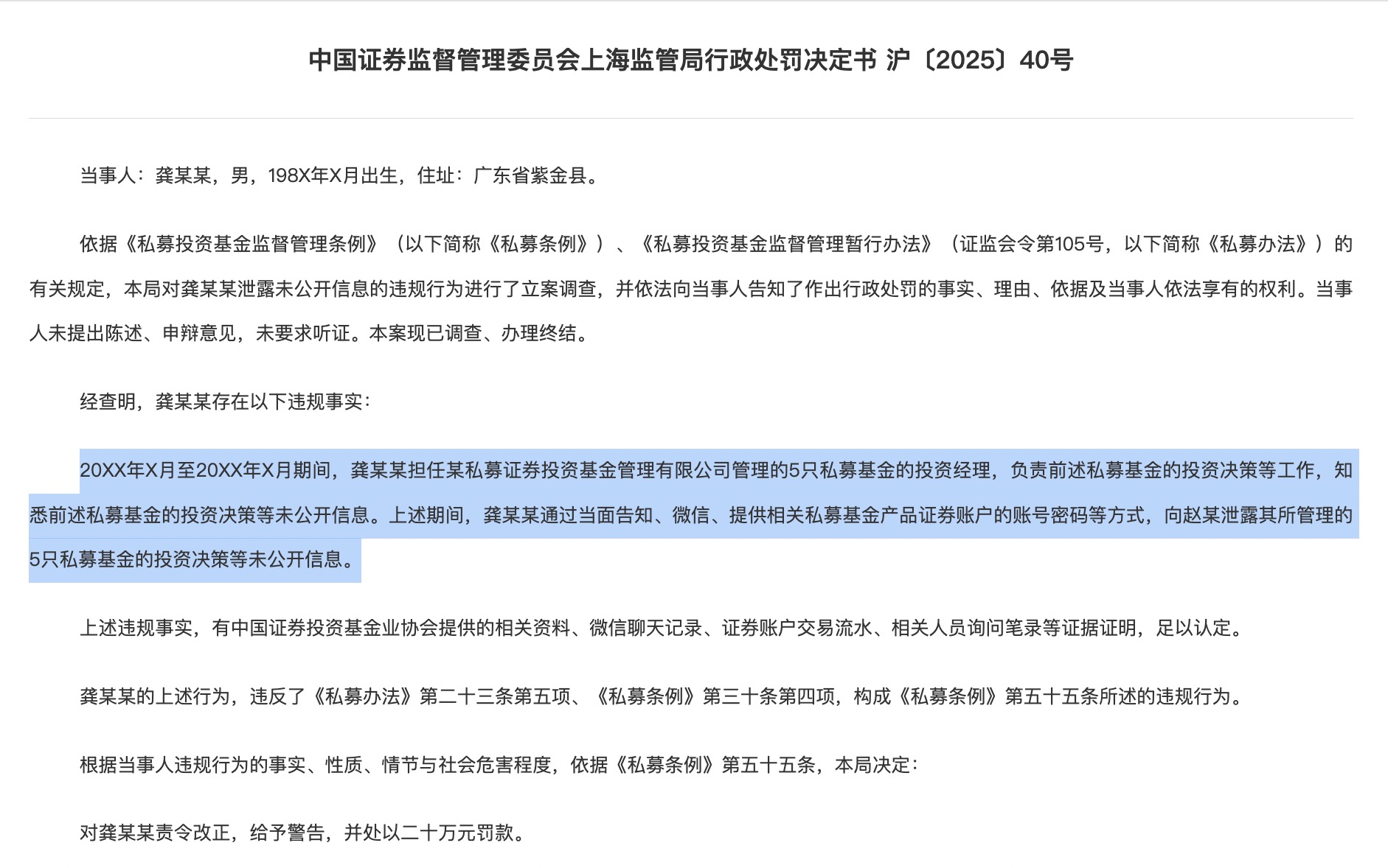 罚单显示,龚某某曾任职于某证券类私募,担任5只私募产品的投资经理,负责并知悉投资决策等工作。在任期间,龚某某通过当面告知、微信、提供相关私募基金产品证券账户的账号密码等方式,向赵某泄露前述5只私募基金的投资决策等未公开信息。