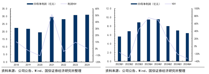2024年公司实现收入407.3亿/+2.99%,归母净利润31.0亿/+0.50%,扣非归母净利润32.3亿/+6.88%;其中2024Q4实现收入97.5亿/-5.71%,归母净利润6.4亿/-32.31%,扣非归母净利润6.4亿/-31.62%。2024年收入微增主要系产能释放带来的销量增加,全年纸制品销量同比+12.8%;利润受木浆成本波动影响,同时广西六景全年固定资产清理减少利润约1.92亿,其中2024Q4影响约968.1万。2024年拟每10股派发现金红利3元,分红率27%。