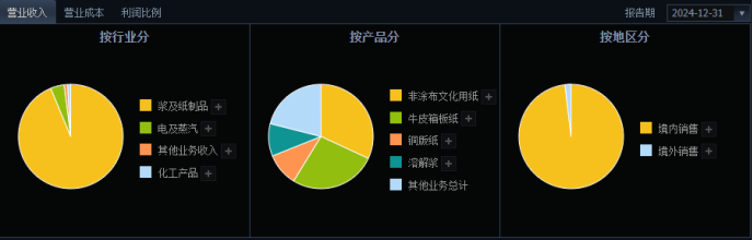 分产品看,2024H2非涂布文化纸、牛皮箱板纸与溶解浆收入同比-11.6%/+9.2%/+32.2%,毛利率为7.9%/15.8%/27.0%,分别较2024H1-10.1pct/+1.2pct/+6.0pct。由于浆价下跌成本支撑较弱,Q4文化纸价持续下跌,叠加高价浆库存使用,盈利收窄;箱板纸在旺季带动下Q4纸价提涨顺利,盈利环比略有改善。