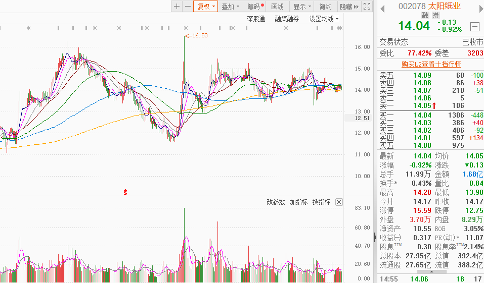 该股近两年股价逆势上升(优于大市);当前股价和估值对比业绩预期处于低估区间,后市增长空间巨大,当下筹码愈发集中,且股东中有多家社保基金、险资以及公私募机构的身影,市值400亿左右;近期横盘整理1个多月,13.5元附近有强支撑,各周期均线都在向上靠拢,大概率向上突破。