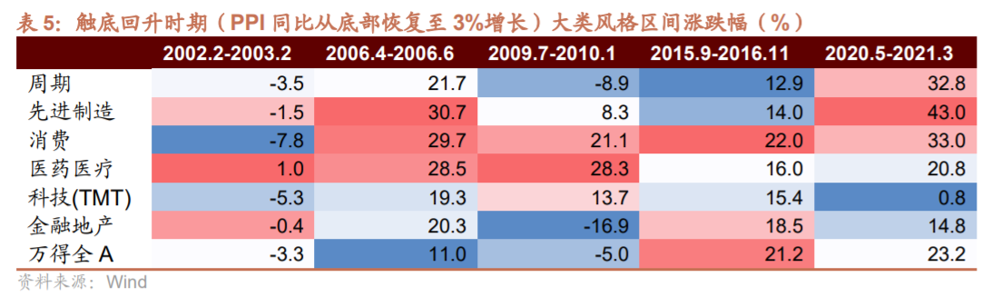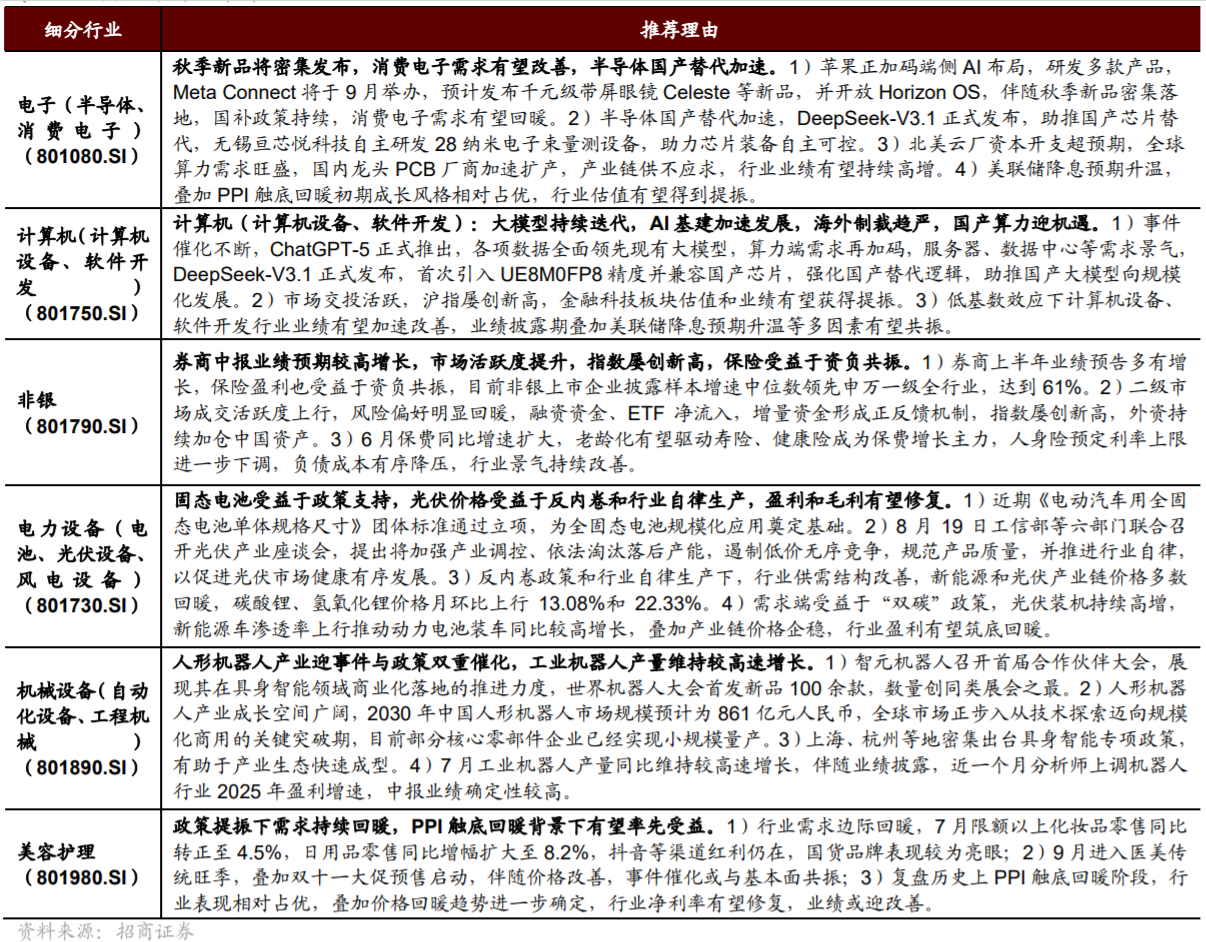 1)在反内卷和投资、生产端增速放缓的驱动下,价格端有望边际改善,7月PPI初见止跌,关注PPI止跌回升对行业的催化。参考过去五轮PPI回升的经验和当前我国经济发展的现在,本轮先进制造领域的电力设备、机械设备,资源品领域的有色金属、基础化工,以及部分消费如美容护理、食品饮料均有望受益;