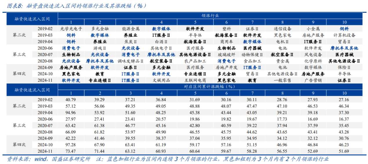 第一次快速流入(2014.8~2015.5)持续时间最长、流入规模最大,但其历史背景包括货币政策转向、大幅降准降息与场外配资的盛行,因而参考价值相对较低。除第一次外,在2019年、2020年、2024年均有融资盘快速流入的情况出现。本文对历史上融资盘快速流入的演绎过程进行回顾分析,重点关注融资盘快速流入的成因、流入放缓的原因以及领涨行业的表现。