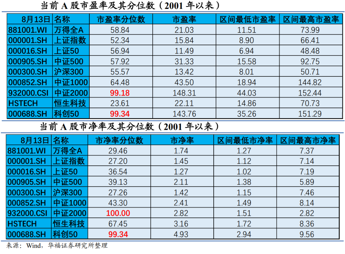 考虑到2006-2007年牛市、2014-2015年牛市,在牛市结束后市场都出现了大幅度波动,其峰值的估值水平存在着较大偏差,我们进一步测算2018年以来的主要指数估值分位数水平,会发现大多数指数的估值水平都到了比较高的程度。从市盈率水平看,除了恒生科技指数,绝大多数A股相关指数的估值分位数都已经达到了80%以上,至少也是80%附近。实际上,当前A股指数估值水平不少已经接近甚至超越2020-2021年牛市的水平了。