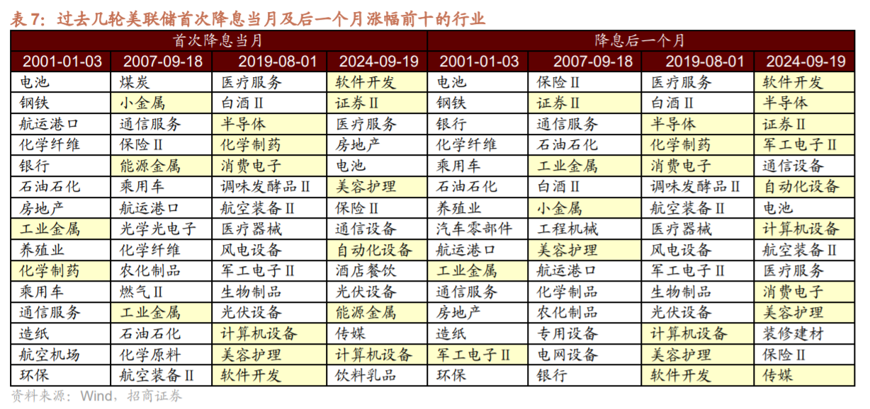 2)9月大概率迎来,美联储降息,从过去几轮美联储首次降息后的行情来看,受流动性驱动的有色金属(工业金属、小金属、贵金属等)、电子(消费电子、半导体)、计算机(计算机设备、软件开发)、证券、美容护理等预计有较好表现;