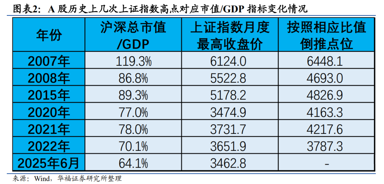 维度二:从市值/GDP这一衡量股票市场泡沫的经典指标来看,距离历次牛市峰值有较大差距。从A股当前的市值来看,截至2025年6月,沪深总市值占GDP比重已经达到了64.1%,但距离历次牛市峰值的比值还有比较大的差距。
