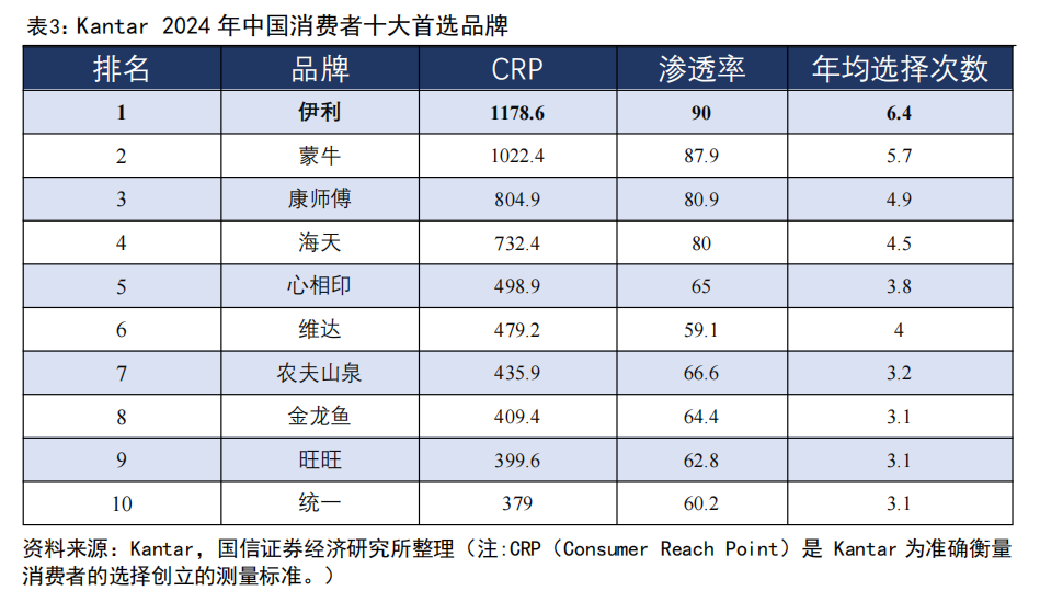 国民品牌家喻户晓,兼具美誉度和辨识度。伊利营销因时俱进,品牌价值领先。2005年,伊利被选为北京奥运会独家乳品赞助商,并与北京奥组委达成长期合作关系;2010年,伊利牵手上海世博会;之后伊利相继赞助了2012年伦敦奥运会、2022年北京冬奥会以及2024年巴黎奥运会。此外,公司亦与《中国好声音》、《奔跑吧兄弟》、《爸爸去哪儿》、《乐队的夏天》等热门综艺合作,迅速放大子品牌声量。在凯度消费者指数评选中,“伊利”以近12亿的消费者触及数和90%的品牌渗透率,连续9年成为消费者选择最多的品牌。