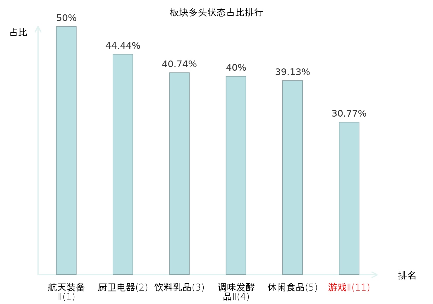 全市场所有行业板块中主力多头状态占比排名中,航天装备Ⅱ板块位居第一。林业Ⅱ板块名次提升最快,较昨日上升92位。
