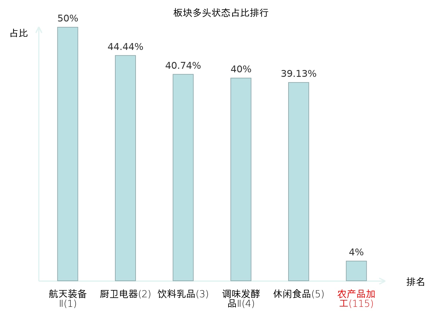 全市场所有行业板块中主力多头状态占比排名中,航天装备Ⅱ板块位居第一。林业Ⅱ板块名次提升最快,较昨日上升92位。