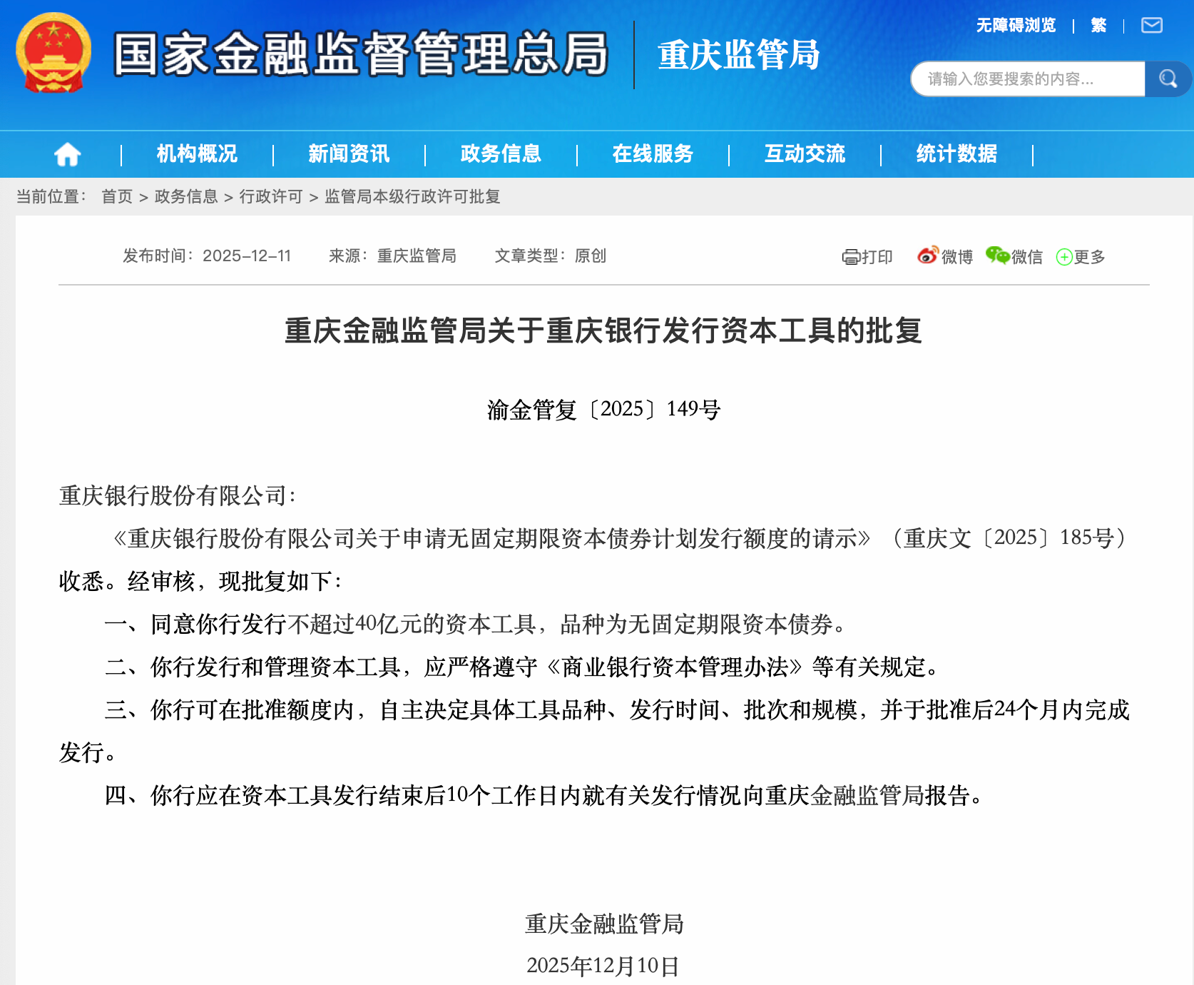 重庆银行获批发行不超过40亿元的无固定期限资本债券