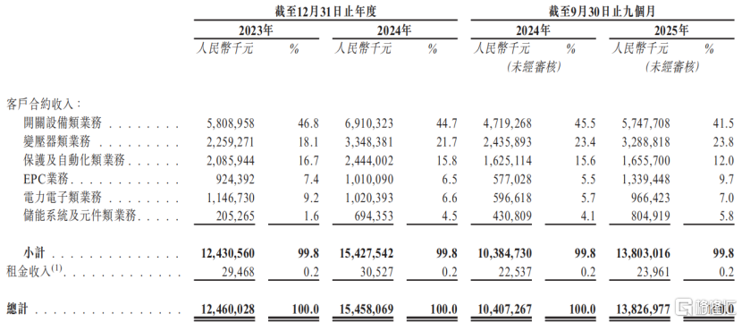 按业务类别划分,开关设备类业务是思源电气的主要收入来源,2025年前三季度的收入占比为41.5%,较2023年有所下降。