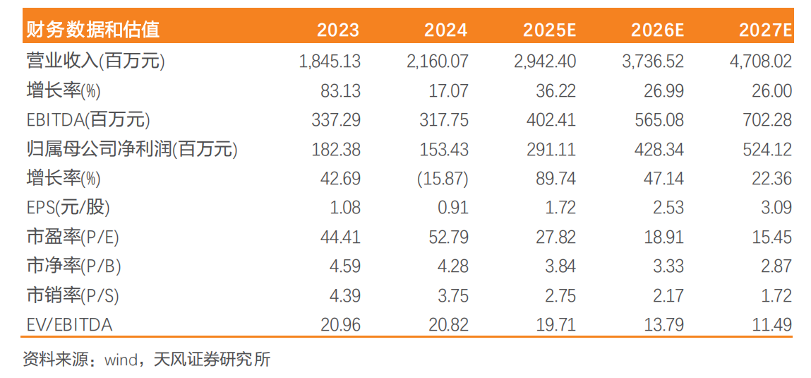 看好公司持续开拓储能、半导体设备、数据中心温控等多行业、多客户,进一步打开公司下游市场空间、业绩持续加速。基于公司24年全年及25年一季度经营情况,以及考虑公司在多行业的稳步开拓潜力,天风证券调整公司25-27年营业收入至29.4、37.4、47.1亿元(原值为25-26年33.3、43.2亿元);归母净利润2.9、4.3、5.2亿元(原值为25-26年3.2、4.2亿元),对应当前估值28、19、15XPE。