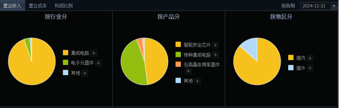 2024实现营收55.11亿元(YoY-27.3%),归母净利11.79亿元(YoY-53.4%)。其中2404营收12.48亿(YoY-35.2%,Q0Q-10.2%),归母净利1.69亿(YoY-66.3%,Q0Q37.8%),营收下降主要为特种电路需求承压。分产品来看,公司集成电路受行业周期调整影响显著,收入25.77亿元(YOY-42.6%)。智能安全芯片业务收入26.38亿元(YOY-7.6%);石英晶体业务逆势增长,24年收入2.24亿元(YoY+20.9%)。毛利率韧性较强。2024年公司毛利率55.8%,同比减少5.4pct;其中集成电路毛利率71.7%,同比下降1.5pct。在2024年下游需求疲软特种电路降价的双重压力下,公司提质增效,特种业务毛利率仍维持高位。智能安全芯片毛利率44.2%,同比下降2.0pct,主要因为新品种尚未形成规模效应,毛利率较低。石英晶体业务受益于下游蓬勃发展,板块毛利率15.6%,同比增长6.5pct。研发费用维持高位。24年公司期间费用率32.8%,YoY+6.4pct,主因收入快速下降,而费用刚性所致。其中研发费用率22.4%,同比增加3.4pct。公司研发费投入强度维持高位,主要用途为研发新型存储器图像AI智能芯片、汽车域控芯片等新品种产品。