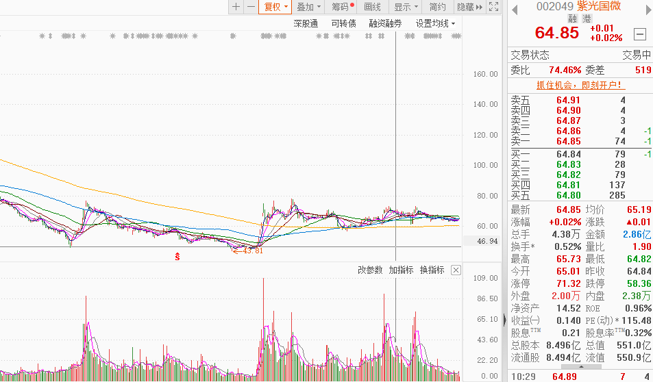 紫光国微当下股价和估值处于上市以来的中位值偏下,前2年股价一路回调,后触底企稳反弹,今年以来股价得到稳步抬升,阶段性底部逐步抬高;在国家半导体大基金和科技自主可控的加持下,公司受到市场的高度关注,中短期乃至长期都有很好的参与价值;且有多家基金(包括社保)和外资持股,近期横盘震荡,各周期均线都在向上靠拢,大概率要向上突破。