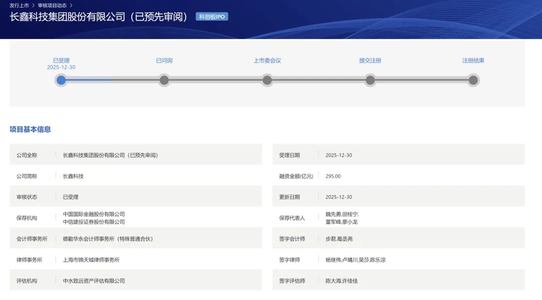 国内DRAM龙头——长鑫科技集团股份有限公司科创板IPO申请12月30日获上交所受理,拟募资295亿元。这家成立于2016年的存储芯片企业有望成为A股“存储芯片第一股”,标志着中国存储芯片产业在资本市场迈出关键一步。