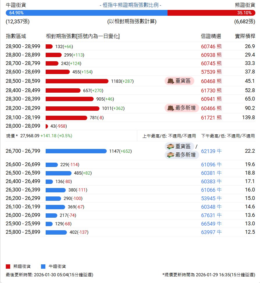 智通财经APP获悉,截至1月30日,恒指最新的牛熊街货比例为65:35。