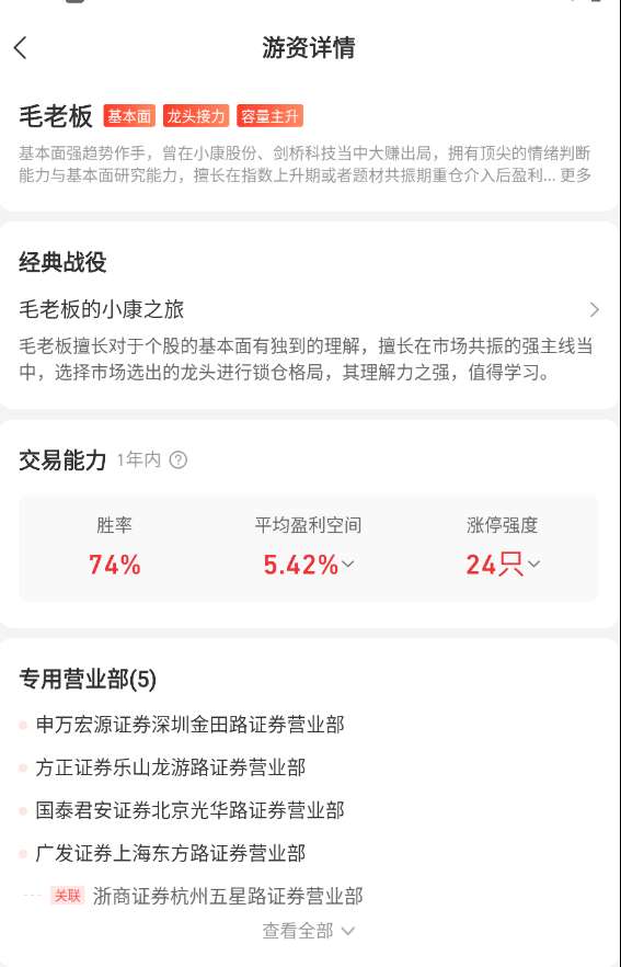 毛老板,主要席位北京光华路,拥有顶尖的情绪判断能力与基本面研究能力,擅长在指数上升期或者题材共振期重仓介入后盈利出局。