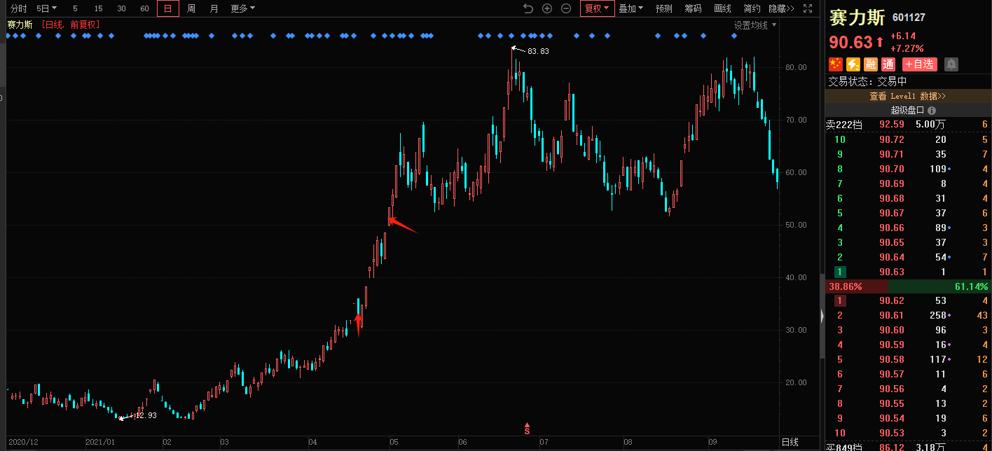 先说小康股份:现在的赛力斯,彼时的小康,2021年4月21日,龙虎榜显示毛老板大卖1个多亿,谁都不知道他的成本是多少,仅仅知道其大赚出局,但事情远没有结束,2021年5月6日,赛力斯高位继续两连板涨停,龙虎榜汇报显示,三日毛老板重新买回,并且买的比之前还要多,总共买入1.6亿,随后赛力斯从50上涨到80,再到现在接近200元,保守估计这一波毛老板入账上亿,可见这些大佬的理解力,真的穿越了时间与空间。