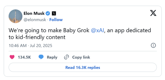Grok近期还因发表反犹言论等争议受到公众质疑。分析认为,“Baby Grok” 主打 “友好型内容”,可以借助 “儿童友好” 的标签重塑公众对xAI的信任,改善其在公众心中的形象。