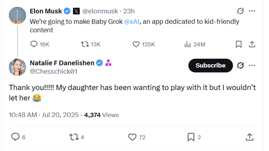 此外,马斯克的 Grok以在回答用户问题时给出粗口回复而闻名。由于儿童也能操作这款聊天机器人,这可能会产生负面影响,这或许也是促使马斯克开发Baby Grok的原因之一。