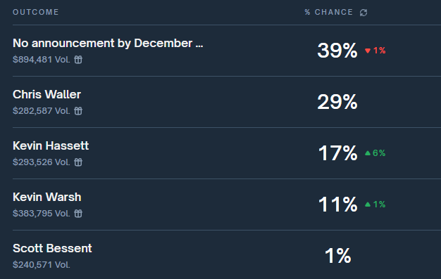 预测平台Polymarket最新数据显示,沃勒是下任美联储主席提名人选的最大热门,概率为29%;哈西特和沃什分列二三,分别为17%和11%。