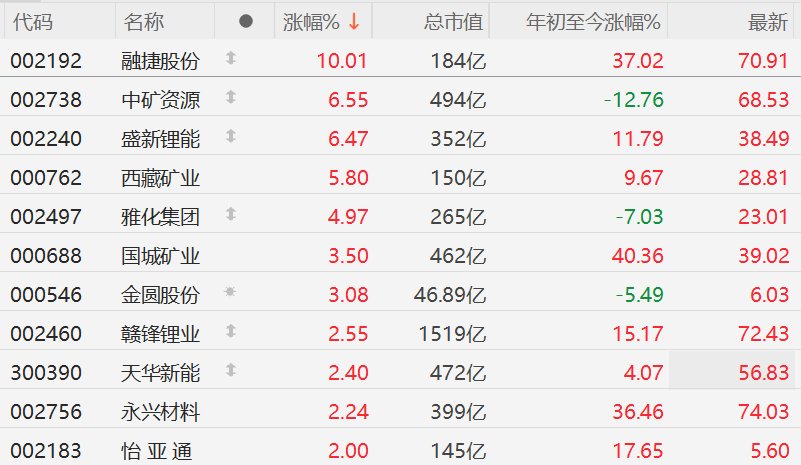 A股锂矿股多数上涨,融捷股份涨停,盛新锂能涨超6%