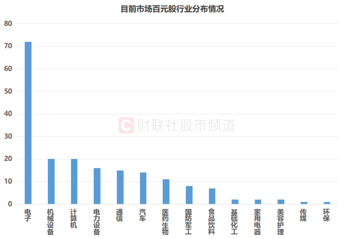 目前,市场191只百元股主要集中在电子、机械设备、计算机三大板块,其合计占比达六成,其中,电子板块独占37.7%。此外,还涵盖电力设备、通信、汽车、医药生物、国防军工、食品饮料、基础化工、家用电器、美容护理、传媒、环保板块。