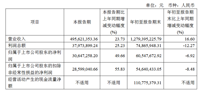财报显示,该公司前三季实现营业收入12.79亿元,同比增长16.60%;归母净利润6054.77万元,同比下滑6.92%;扣非归母净利润5464.04万元,同比下滑8.48%。
