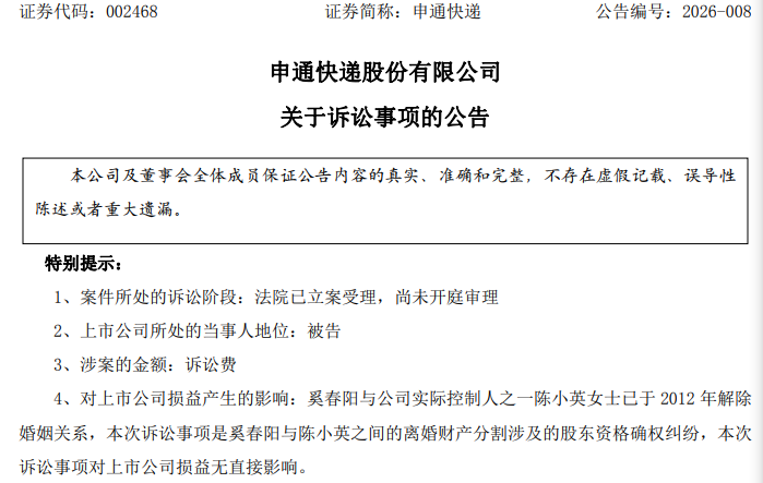 针对本次诉讼对公司的影响,申通快递表示,涉诉股份约占上市公司总股本的1.33%,该事项不会对公司正常生产经营、内部治理和规范运作产生重大不利影响,也不会改变公司的实际控制权。同时,公司指出,本次诉讼目前仅处于法院立案受理阶段,尚未开庭审理,亦未产生具有法律效力的判决或裁定,陈小英名下持有公司股份是否发生权益变动仍存在不确定性。