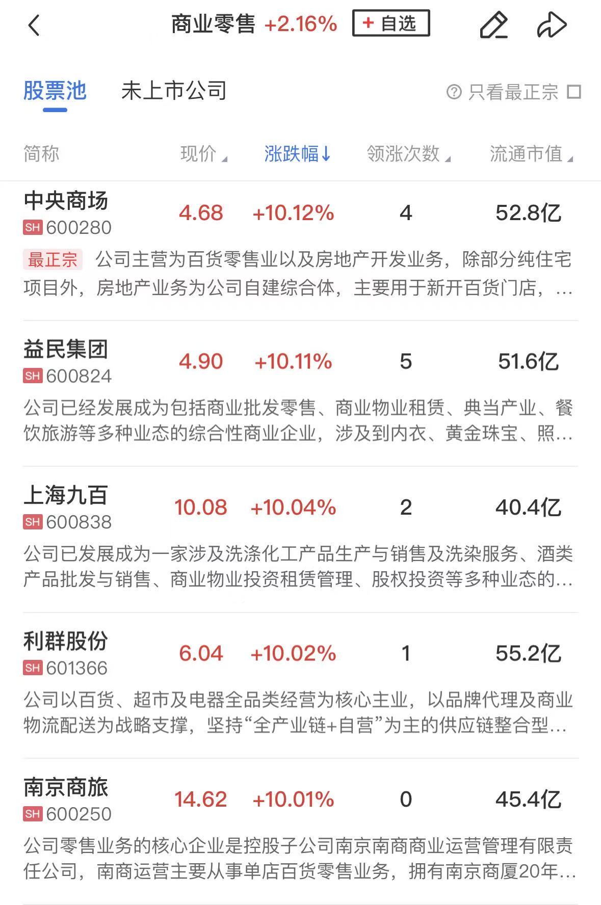 零售板块反复活跃,中央商场益民集团上海九百利群股份百大集团等涨停,皇庭国际中百集团友好集团等涨幅居前。