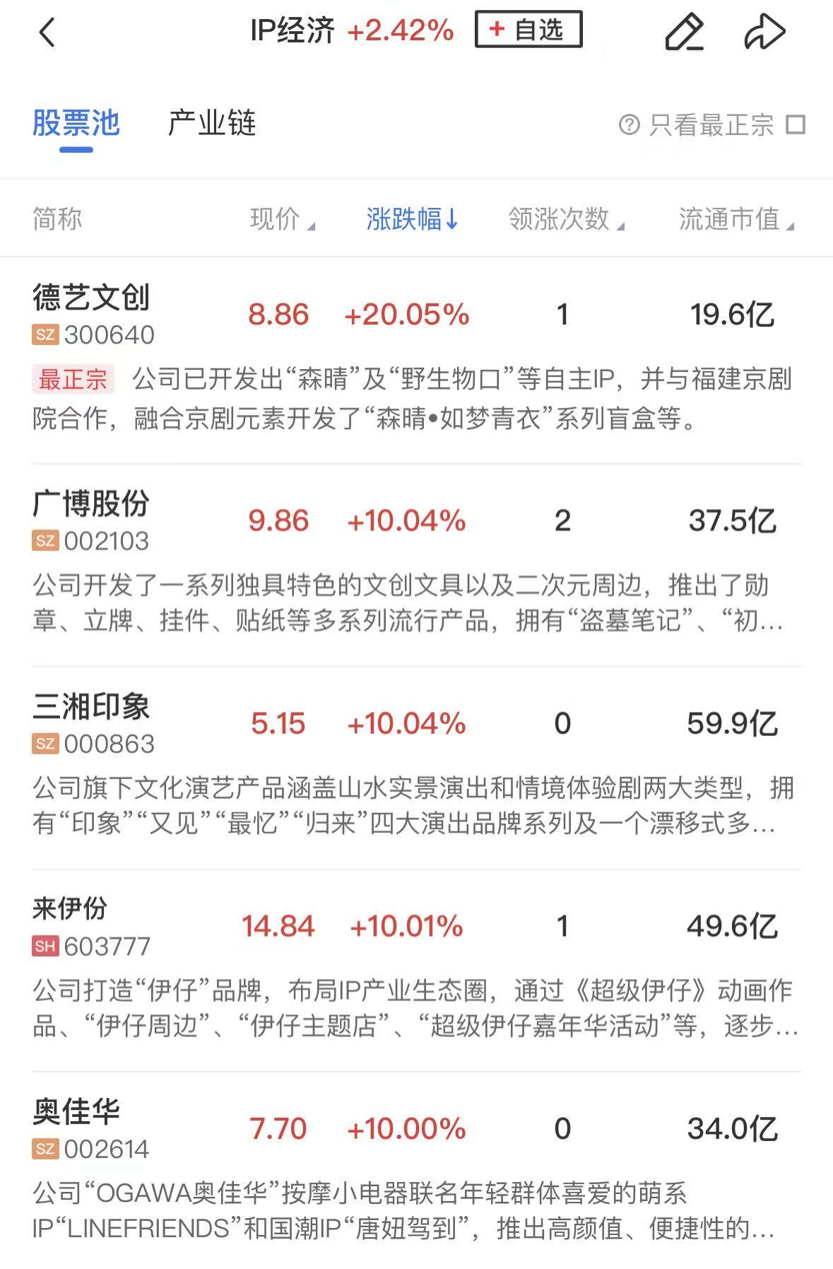 IP经济概念表现亮眼,德艺文创广博股份三湘印象来伊份等个股涨停,莱绅通灵锋尚文化京华激光等跟涨。