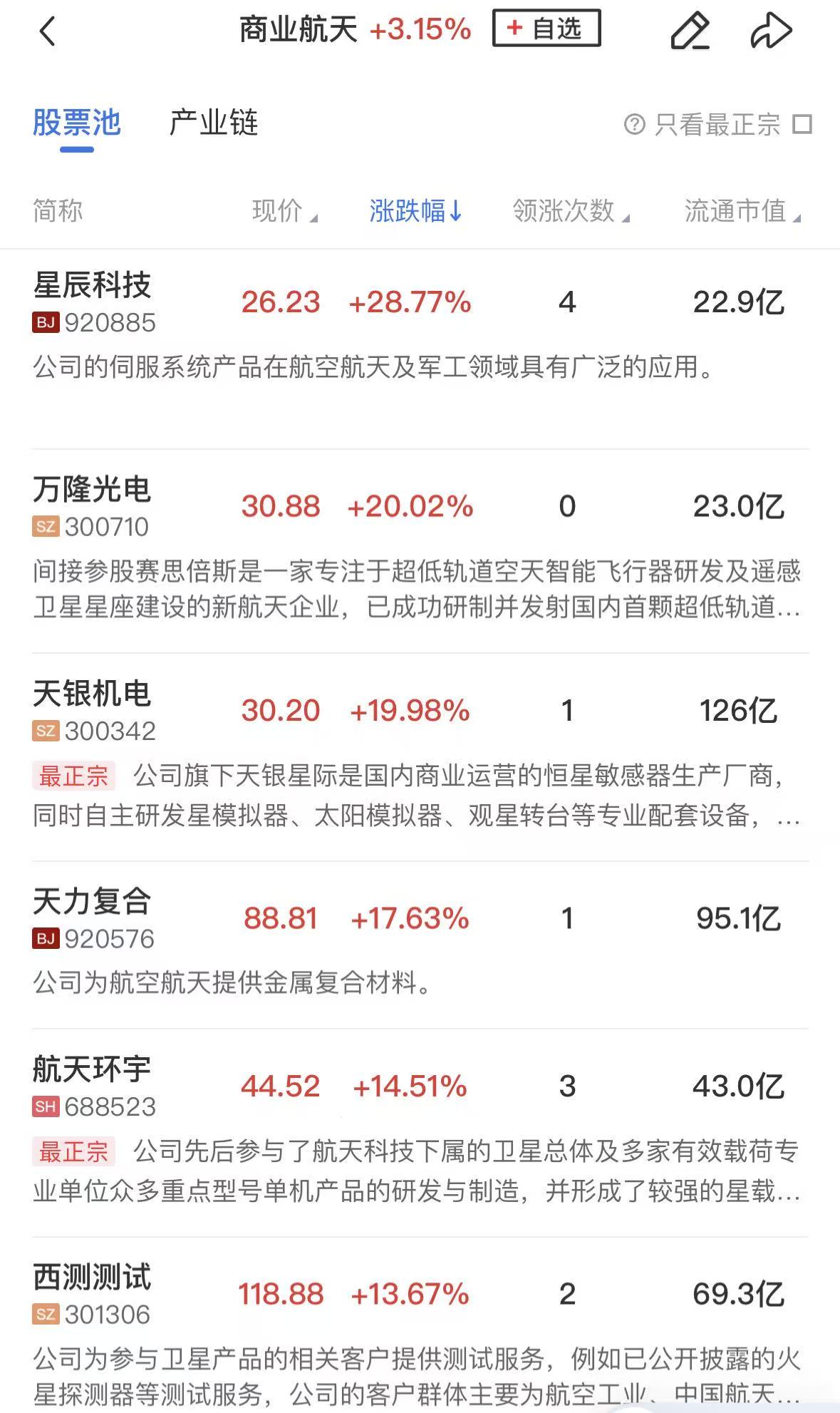 板块上,商业航天概念股再度走强,中国卫星天银机电北摩高科西部材料天箭科技上海沪工等多股涨停,航天环宇邵阳液压西测测试涨超10%。