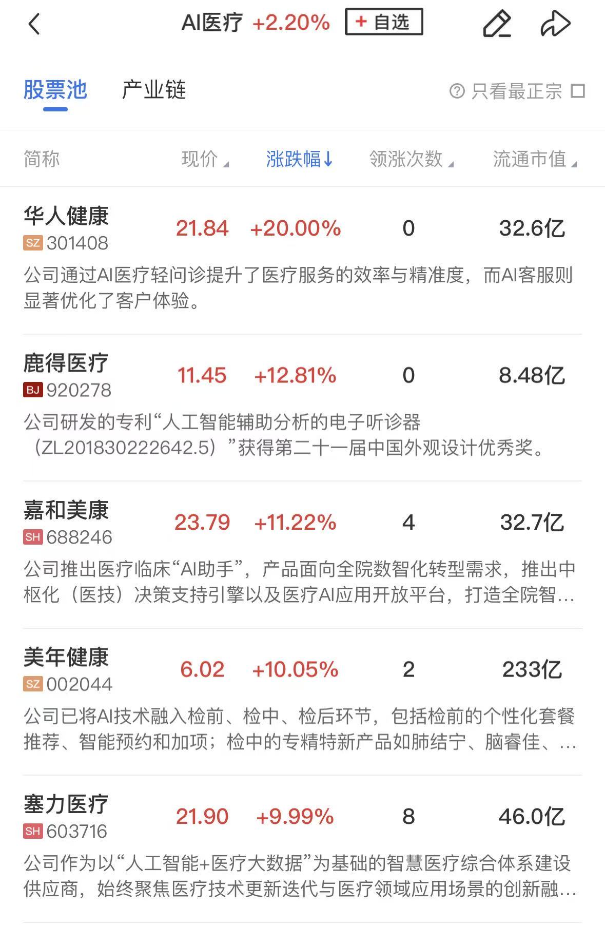 AI医疗概念同样震荡拉升,华人健康美年健康塞力医疗涨停,嘉和美康鹭燕医药思创医惠卫宁健康等涨幅居前。消息面上,12月16日,蚂蚁集团旗下AI健康应用“蚂蚁阿福”发布后下载量猛增,今日冲上苹果应用榜总榜第三位。据悉,“蚂蚁阿福”App月活用户规模已超1500万,每天回答用户500多万个健康提问。